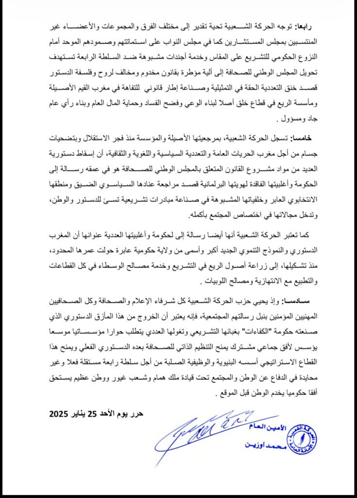 وفي ختام بيانها، دعت الحركة الشعبية إلى فتح حوار مؤسساتي موسع ومسؤول حول مستقبل تنظيم قطاع الصحافة، يقوم على احترام مبدأ التنظيم الذاتي، ويضمن استقلالية حقيقية للسلطة الرابعة، باعتبارها ركيزة أساسية في الدفاع عن الوطن والمجتمع، في ظل القيادة الرشيدة لصاحب الجلالة الملك محمد السادس
