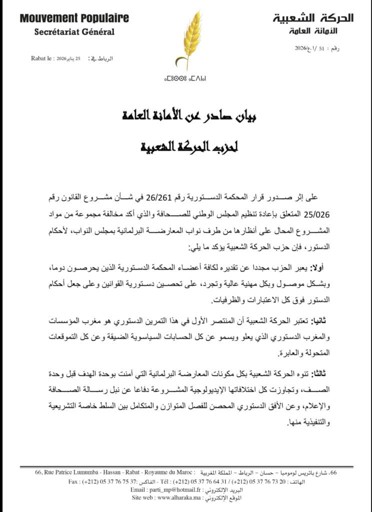 أصدرت الأمانة العامة لحزب الحركة الشعبية بياناً سياسياً قوياً، على إثر صدور قرار المحكمة الدستورية رقم 26/261 المتعلق بمشروع القانون رقم 25.026 الخاص بإعادة تنظيم المجلس الوطني للصحافة، وهو القرار الذي قضى بعدم دستورية عدد من مواد المشروع، استجابةً للطعون المقدمة من طرف مكونات المعارضة البرلمانية بمجلس النواب.