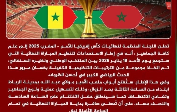 أصدر الاتحاد المغربي لكرة القدم، نيابة عن اللجنة المنظمة المحلية لبطولة كأس أمم أفريقيا 2025، بياناً رسمياً يوضح الترتيبات التنظيمية للمباراة النهائية بين المنتخبين المغربي والسنغالي على ملعب مولاي عبد الله، رداً على شكاوى الاتحاد السنغالي.